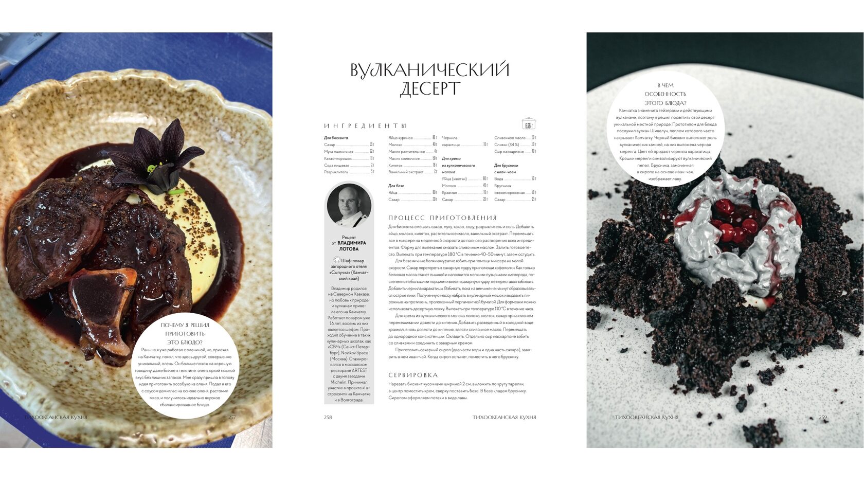 Recipes for the book were contributed by chefs from the “GastroCamp” project team: Tongsuk Channamom (Thailand), Anton Salknikov (Moscow), Vladimir Lotov (Kamchatka), Alexander Chernyshov (Moscow), Igor Pintusov (Kamchatka), Kirill Volovik (Chukotka), Andrey Legkiy (Moscow), Yulia Serbina (Kamchatka), and Igor Cherkasov (Kamchatka).