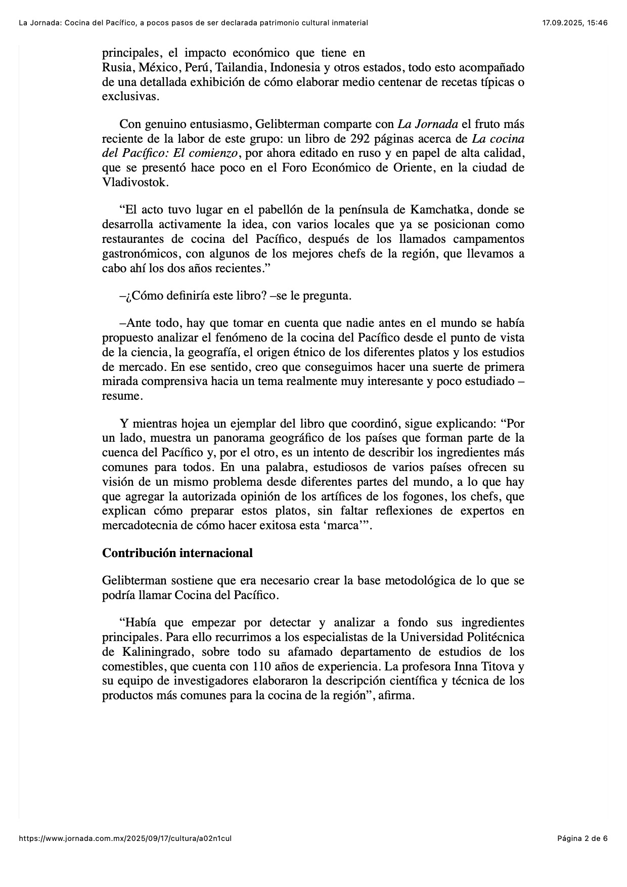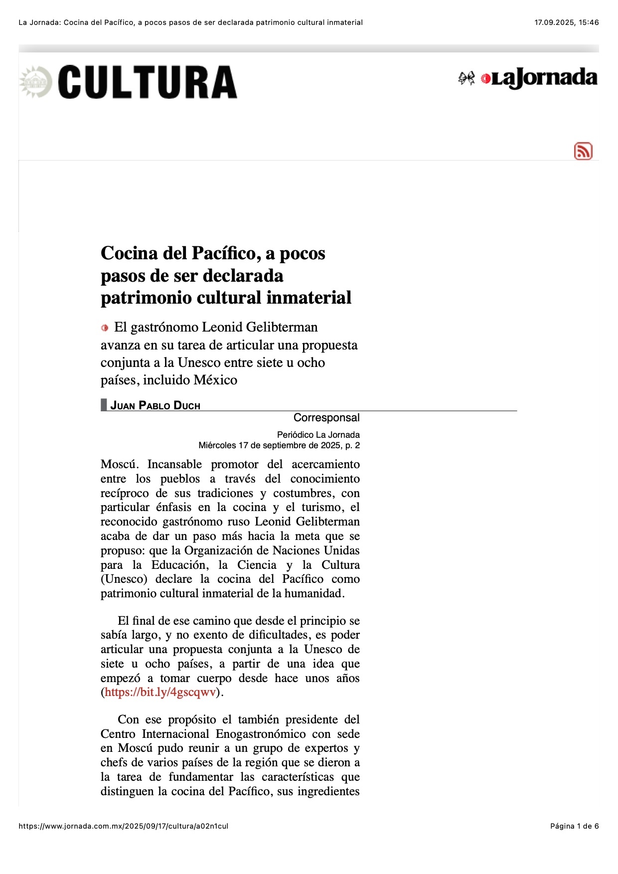 The leading Mexican newspaper La Jornada de Enmedio has published an analytical article by its journalist Juan Pablo Duch. The piece is dedicated to the project “Pacific Cuisine”, developed by the International Enogastronomic Center in cooperation with the Government of Kamchatka Krai. Particular attention in the article is given to the book “Pacific Cuisine. The Beginning”, which was presented by the Government of Kamchatka Krai at the international economic forum in Vladivostok this September.